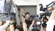 [사진] 비상구 앞에서 취재진에 붙들린 이상무 참좋은여행 전무이사