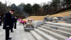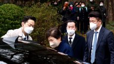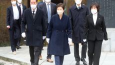 '올림머리' 밝게 웃은 박 전 대통령…부친 묘역서 8분간 머물다 대구행