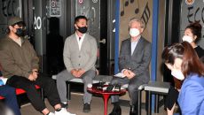 [헤럴드경제=이상섭 기자] 더불어민주당 대선주자인 이재명 (오른쪽 세번째)경기도지사가 7일 오전 서울 종로구의 한 코인노래방에- 2021.10.07 10:41