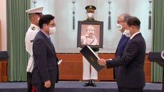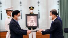 문재인 대통령은 17일 서거 78년 만에 고국에 귀환한 고(故) 홍범도 장군에게 건국훈장 최고등급인 ‘대한민국장’을 추서하면서- 2021.08.17 14:07