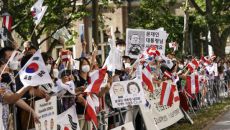 文대통령 환영 나온 교민들 '이니, 숙이 마음대로 해' 팻말 눈길