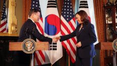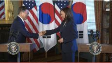 해리스, 문 대통령과 악수 뒤 손 닦았다?…美 인터넷 ‘갑론을박’