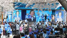 (서울=연합뉴스) 조민정 기자 = 더불어민주당 박영선 후보는 31일 동작 유세에 당명이 사라진 파란색 점퍼를 입고 등장했다.- 2021.03.31 12:14