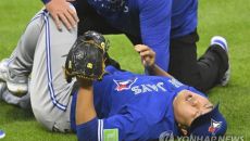 악! 류현진 157.2㎞ 강한타구에 쓰러졌다…구단 공식 발표 "오른쪽 무릎 타박상"
