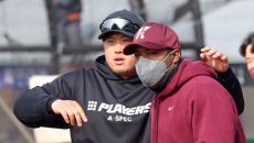 4일 한화 이글스와 키움 히어로즈의 프로야구 연습 경기를 앞둔 대전 한화생명이글스파크에서 덩치 큰 두 사내가 반갑게 인사를 나- 2022.03.04 21:50