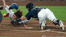홈으로 파고들어 득점 올리는 추신수 (시애틀 AP=연합뉴스) 텍사스 레인저스 추신수(왼쪽)가 7일(현지시간) 미국 워싱턴주 시- 2020.09.09 13:40