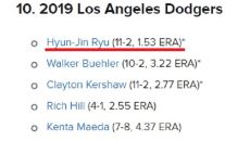 '류현진 맹활약' 다저스 선발진, 美 CBS스포츠 선정 역대 10위