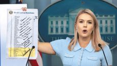 캐럴라인 레빗 미국 백악관 대변인이 지난달 30일 도널드 트럼프 대통령이 제롬 파월 연방준비제도 의장에게 보낸 기준금리 비교표- 2025.07.02 01:08