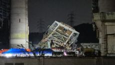 8일 저녁 울산화력발전소 보일러 타워 5호기 붕괴 사고 현장에서 추가 붕괴 가능성이 있는 4호기와 6호기 해체 준비가 이뤄지고- 2025.11.08 18:58
