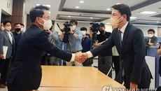 (춘천=연합뉴스) 이해용 기자 = 국민의힘 김진태 강원도지사 당선인과 더불어민주당의 육동한 춘천시장 당선인이 강원도청사 이전- 2022.06.08 16:58