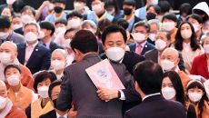 '서울시장 라이벌' 오세훈-송영길, 조계사서 포옹 인사 [TF포착]