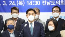 (무안=연합뉴스) 여운창 기자 = 김한종 전남도의회 의장은 24일 전남도의회 브리핑룸에서 기자회견을 하고 "장성군민이 주인 되- 2022.03.24 15:31