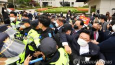 (서울=연합뉴스) 전명훈 이은정 기자 = 국민의힘 의원 약 50명이 23일 오전 대법원 앞에서 김명수 대법원장의 출근 저지를- 2021.04.23 10:32