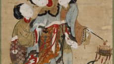 물결 치는 비단옷을 입은 귀부인이 고개를 가누지 못하고 비틀거리자 양 옆의 궁녀가 부축하고 있다. 한 궁녀가 왼손에 든 등(燈- 2025.04.23 16:08