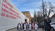 3일(현지시간) 노르웨이 트론헤임의 노르덴펠트스케 응용미술관 외벽, 선명한 분홍색 글자가 수놓았진 흰 망사 가림막이 걸렸다.- 2025.04.07 00:01
