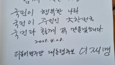 [the300] 이재명 더불어민주당 대선후보가 현충원을 참배하고 방명록에 "국민이 행복한 나라, 국민이 주인인 大(대)한민국,- 2025.04.28 10:21