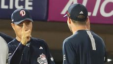 (서울=연합뉴스) 이대호 기자 = 프로야구 두산 베어스 조성환 감독 대행이 LG 트윈스의 13개에 달하는 견제구에 불편한 기색- 2025.07.27 16:58
