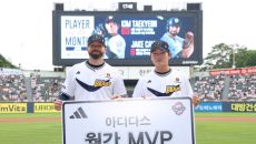 (서울=연합뉴스) 김동찬 기자 = 프로야구 두산 베어스가 6월 아디다스 최우수선수(MVP)로 제이크 케이브(야수)와 김택연(투- 2025.07.07 10:20