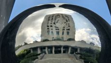 심우정 검찰총장이 임기 9개월만에 사의를 표명한 1일 서울 서초구 대검찰청 조형물을 통해 보이는 대검청사가 일그러져 보이고 있- 2025.07.01 15:33