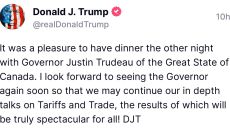 도널드 트럼프 당선인이 자신의 소셜미디어인 트루스소셜에 캐나다를 ‘주(州)’로, 쥐스탱 트뤼도 캐나다 총리를 ‘주지사’로 표현- 2024.12.11 00:51