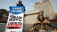 [이데일리 박태진 기자] 국민의힘이 김명수 대법원장 자진사퇴를 촉구하는 1인 시위를 3일째 이어가면서 김 대법원장과 정부를 연- 2021.02.09 11:28