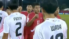 북한 U-17 축구대표팀이 일본 선수들과의 인사 과정에서 주먹을 강하게 내려치는 행동을 보여 비매너 논란이 일었다. 해당 장면- 2025.11.20 11:46