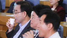 물 마시는 주호영 원내대표-오세훈 전 시장