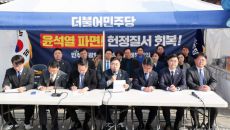 더불어민주당 박찬대 원내대표와 의원들이 1일 서울 종로구 정부서울청사 앞에서 마은혁 재판관 임명 촉구 긴급기자회견을 하고 있다- 2025.04.01 10:51