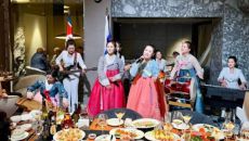 모듬회가 수북이 담겼습니다. 한복 입은 직원이 마이크를 잡고 장구를 든 사람도 있습니다. 뒤쪽으로는 러시아와 북한 국기가 나란- 2025.11.28 10:07