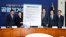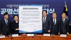 정청래 더불어민주당 대표와 김병기 원내대표, 김정호 중앙당선관위원장 등이 19일 국회에서 열린 공명선거 실천 서약식에서 후보자- 2025.12.19 11:22