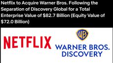 넷플릭스와 워너브러더스 디스커버리는 지난 5일(현지시간) 기업가치 827억 달러, 지분가치 720억 달러 규모의 인수 계약을- 2025.12.09 08:00