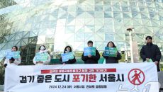 (서울=뉴스1) 신웅수 기자 = 연세로 공동행동 회원들이 24일 서울시청 앞에서 가진 연세로 대중교통전용지구 해제 규탄 기자회- 2024.12.24 14:37