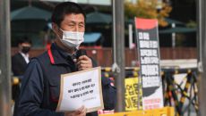 [서울=뉴스핌] 최상수 기자 = 양동규 민주노총 부위원장이 26일 오전 서울 여의도 한국산업은행 앞에서 열린 '기업결합 심사- 2021.10.26 12:21