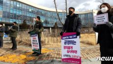 (세종=뉴스1) 장수영 기자 = 민주노총 전국공공운수노조 아시아나항공노조 조합원들이 15일 정부세종청사 공정거래위원회 기자실에- 2021.01.15 13:21