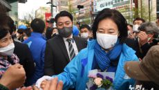 국회사진취재단 박영선 더불어민주당 서울시장 후보가 4일 오후 서울 노원구 롯데백화점 앞 광장에서 시민들과 인사하고 있다. 저작- 2021.04.04 19:32