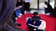 7일 오전 서울 여의도 국회 앞에서 윤석열 대통령의 탄핵을 촉구하며 농성중인 시민이 스마트폰으로 대통령 대국민담화를 시청하고- 2024.12.07 11:01