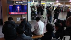 대통령 탄핵소추안 표결을 앞둔7일 서울역 대합실에서 시민들이 윤석열 대통령 대국민 담화 중계를 지켜보고 있다. 김민수기자 ms- 2024.12.07 10:43