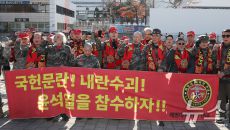 (서울=뉴스1) 임세영 기자 = 해병대예비역연대 관계자들이 5일 서울 용산구 대통령실 인근에서 ‘국헌문란 내란수괴 윤석열을 참- 2024.12.05 12:43