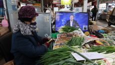 윤석열 대통령 대국민담화 지켜보는 시장상인
