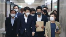 [서울=뉴스핌] 이형석 기자 = 이준석 국민의힘 대표 등 지도부가 9일 오전 서울 여의도 국회에서 열린 최고위원회의에 입장하고- 2021.09.09 10:39
