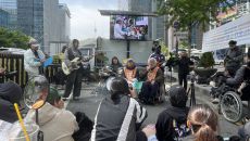 [이데일리 이영훈 기자] 21일 오전 서울 광화문 세종대로 사거리 버스승강장에서 전국장애인차별철폐연대(전장연)가 이동권 보장- 2026.04.21 10:21