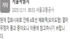 서울 지하철 4호선이 무정차 통과 중이다. 서울교통공사는 11일 오전 8시 53분께 "현재 집회 시위로 인해 4호선 혜화역(오- 2025.12.11 08:56