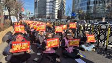 (서울=뉴스1) 황기선 기자 = 민주노총 전국철도노조 코레일네트웍스지부, 철도고객센터지부 소속 조합원들이 22일 오후 서울 용- 2025.12.22 15:24