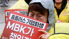 (서울=뉴스1) 권준언 기자 = 홈플러스의 기업회생 절차 이후 대주주 MBK파트너스를 규탄하는 집회를 하던 노동조합원에게 상해- 2025.11.24 16:56