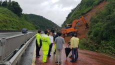 [거제=뉴시스] 신정철 기자 = 경남 거제시 장목면 거가대교 부산방향 인근 야산에서 산사태가 발생해 차량이 통제됐다. 18일- 2023.07.18 16:10
