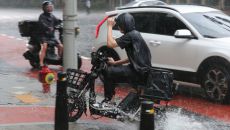 [서울=뉴스핌] 이형석 기자 = 22일 오후 서울 여의도 인근에서 오토바이를 탄 시민이 갑작스럽게 내리는 비를 맞으며 이동하고- 2023.08.22 17:29