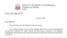 “고맙습니다,용인특례시’…주한 필리핀 대사서 잼버리 지원 감사 편지 받아