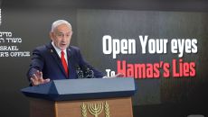[포토] 발언하는 네타냐후…벽엔 '하마스 거짓말에 눈떠라'