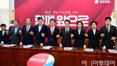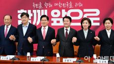 아시아투데이 이병화 기자 = 김문수 국민의힘 대통령 후보와 공동선대위원장들이 11일 국회에서 열린 중앙선거대책위원회 회의에 앞- 2025.05.11 17:06