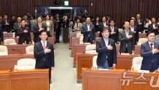 아시아투데이 이병화 기자 = 김문수 국민의힘 대선 후보가 11일 국회에서 열린 의원총회에서 국민의례를 하고 있다. ⓒ "젊은- 2025.05.11 15:58